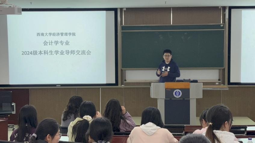 在导师代表发言环节,崔雯雯、陈韵竹、游鸿、汪军、李宁、郭晓、杨晋渝七位老师依次分享经验。各位导师结合自身求学经历、从教心得与科研方向,从会计专业知识体系构建、专业技能提升、学术思维培养、职业路径选择等方面,为同学们提供了针对性建议。他们强调,会计专业学习需注重理论与实践结合,既要夯实专业基础,也要关注行业动态与政策变化;同时鼓励同学们树立明确目标,主动向导师请教课程学习、科研项目参与、论文写作、考公考研等方面的疑问,在专业领域深耕细作、稳步前行。