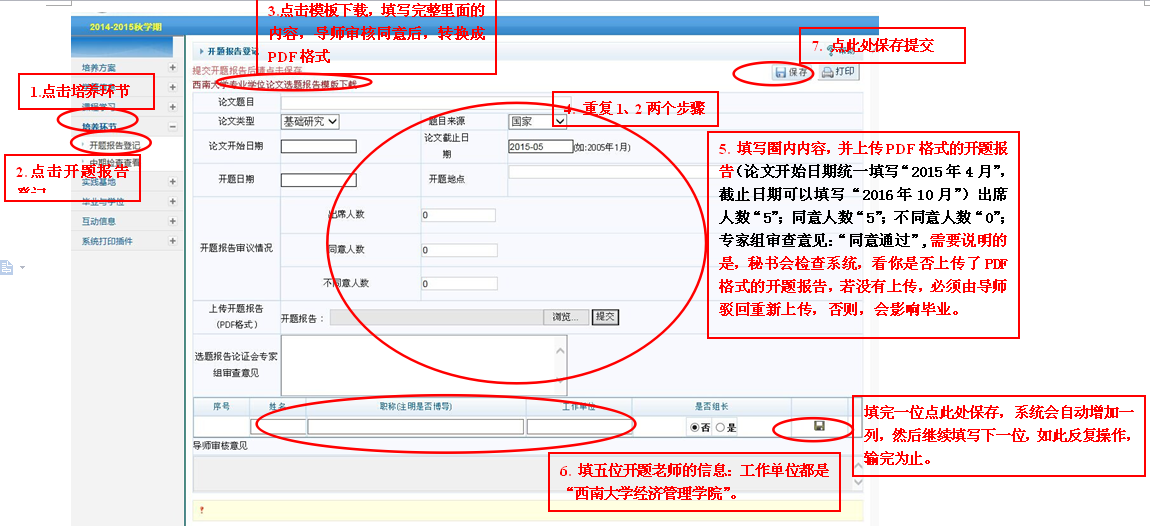 4.1 修改论文提纲与提交论文选题报告:开题后,要根据开题论证会老师所提建议,与导师商讨,认真修改论文提纲并在MIS系统(新系统)中完善论文选题报告。具体操作请见下图: