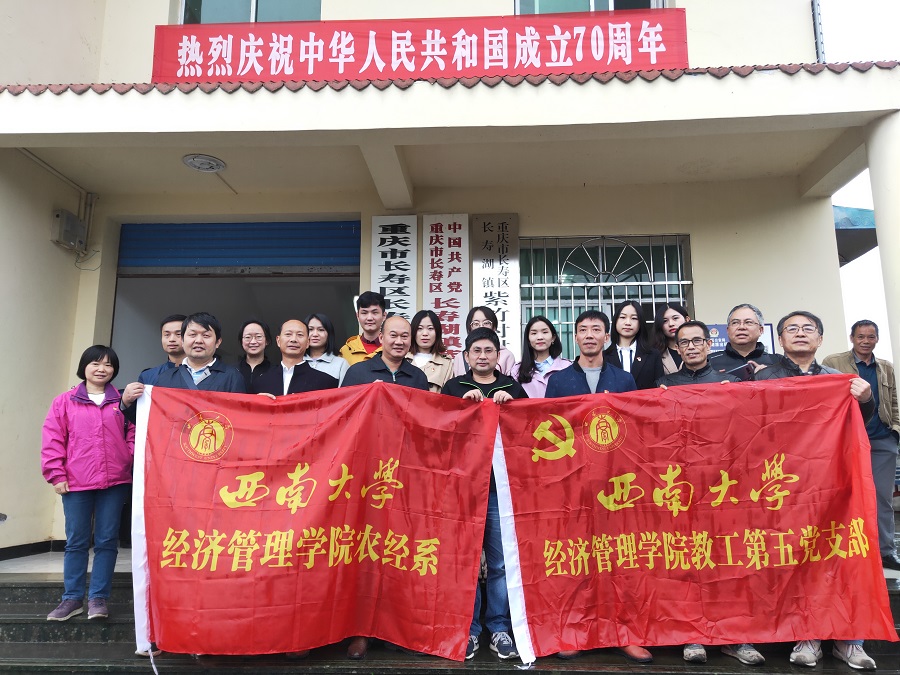 为进一步扎实开展“不忘初心、牢记使命”主题教育、发挥专业学科优势助力乡村振兴,同时为进一步完善农经专业人才培养模式、加强实践教学、提升公司农经专业员工的实践能力、就业能力和社会责任感,农经系党支部和紫竹村党支部共建暨实习实训基地授牌仪式,于2019年10月25日在长寿区长寿湖镇紫竹村举行。太阳成集团tyc522cc农经系党支部书记周洪文带领农经系党支部部分党员、老师代表及员工代表参加此次活动。紫竹村党支部书记陈恩、村委会主任黄大富分别接受牌匾。