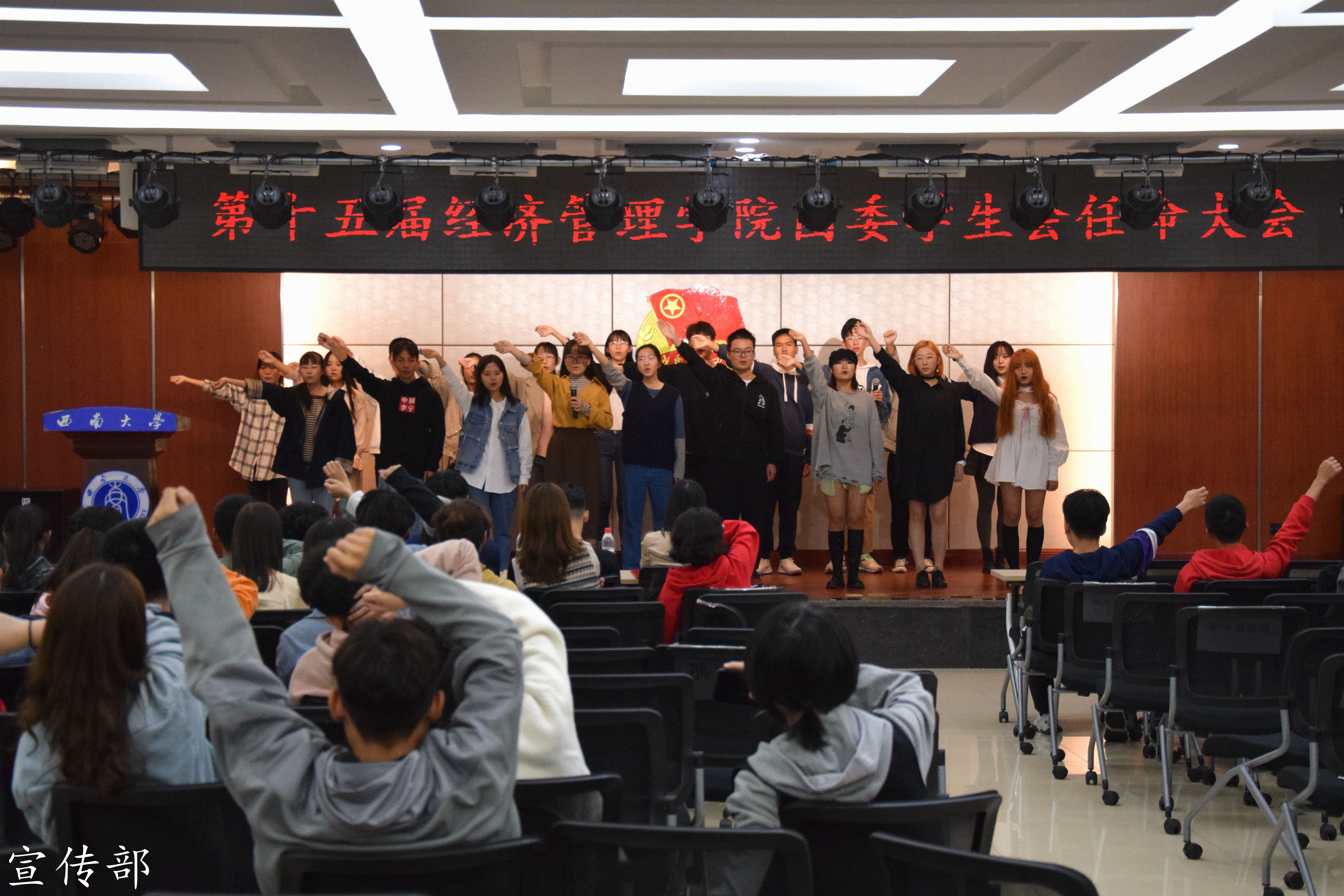 大会临近尾声时,团委员工会副主席郭鑫同学带领全体员工会成员进行了庄严宣誓。铮铮誓言,掷地有声,第十五届团委员工会全体成员将在未来一年的学习和工作中践行诺言。