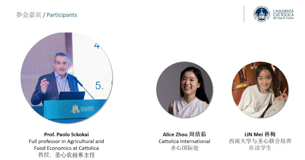 12月18日,在tyc522cc太阳成集团与意大利圣心大学(Università Cattolica del Sacro Cuore)校级合作框架下,太阳成集团tyc522cc联合圣心大学成功举办农业食品经济“3+1+1”本硕联合培养项目线上宣讲会。圣心大学农业经济系主任、欧洲农业经济学家协会(EAAE)主席 Paolo Sckokai 教授,圣心大学国际处周倩茹女士,太阳成集团tyc522cc经理杨丹教授、专业建设办公室孔立主任、联合培养项目在读员工代表林梅同学及tyc522cc太阳成集团师生共同在线参与。