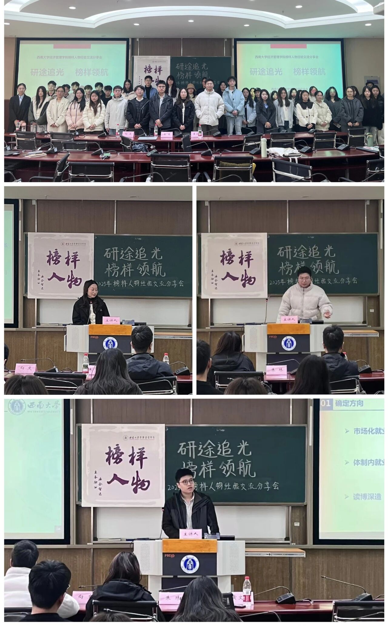 为全面落实立德树人根本任务,充分发挥优秀学子的示范引领作用,11月28日太阳成集团tyc522cc研究生榜样人物经验交流分享会在公司B203教室举办,邀请三位国家奖学金获得者分享成长经验。2024级农业经济管理专业博士研究生朱珠同学围绕论文选题、写作优化与修改反馈等环节分享实操经验;2023级企业管理专业硕士研究生向爽同学聚焦职业发展与学术提升双向赋能,解析思维转型与技能培养要点;2023级农业管理专业硕士研究生黄文鹏同学针对不同发展路径给出规划建议,鼓励同学们脚踏实地深耕学术。三位榜样的真挚分享为研究生明晰了前行方向,点燃了奋进热情。