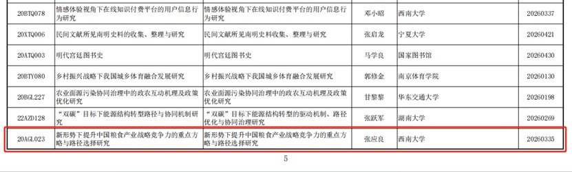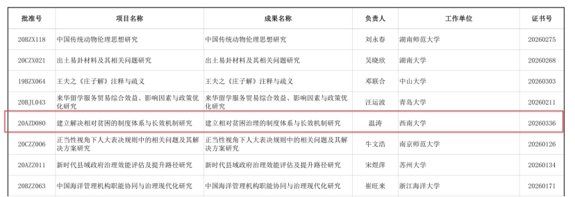 全国哲学社会科学工作办公室发布了《2026年1月国家社科基金年度项目结项情况》通告。公司温涛教授主持的国家社会科学基金重点项目《建立相对贫困治理的制度体系与长效机制研究》(批准号:20AZD080)和张应良教授主持的国家社会科学基金重点项目《新形势下提升中国粮食产业战略竞争力的重点方略与路径选择研究》(批准号:20AGL023)均以“优秀”等级通过结项鉴定。