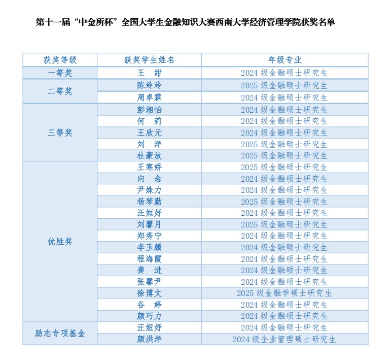 公司22名硕士研究生获奖,创历年参赛最佳成绩。其中,金融硕士研究生王甜荣膺大赛一等奖;陈玲玲、周卓霖获二等奖;彭湘怡、何莉、王欣元、刘洋、杜豪放获三等奖;王寒娇等14人获优胜奖;汪姮妤、颜洪洋荣获励志专项基金奖励。