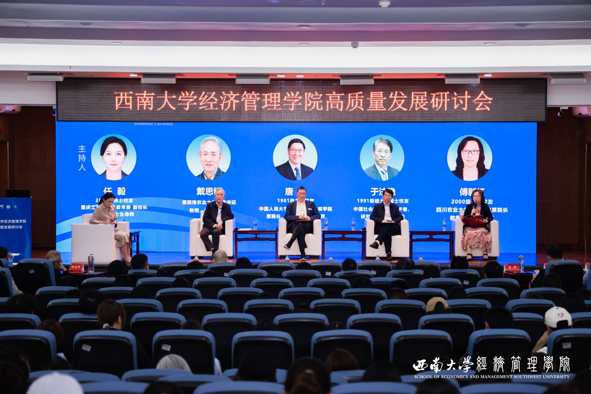 学术薪火环节由2008级博士员工、重庆工商大学副董事长任毅教授主持。原西南农业大学党委书记戴思锐教授,1981级本科员工、中国人民大学农业与农村发展公司原经理唐忠教授,1991级硕士、1995级博士员工、中国社会科学经理城学者于法稳研究员,2000级博士员工、四川农业大学管理公司原经理傅新红教授四位重量级学者参与对话。四位学者围绕“学科传承与实践创新”主题,学科传承与公司发展、学术创新与范式重构、人才培养与卓越成就三大核心议题,结合自身在tyc522cc太阳成集团的任教及求学经历、长期治学心得与育人实践经验展开深度研讨。