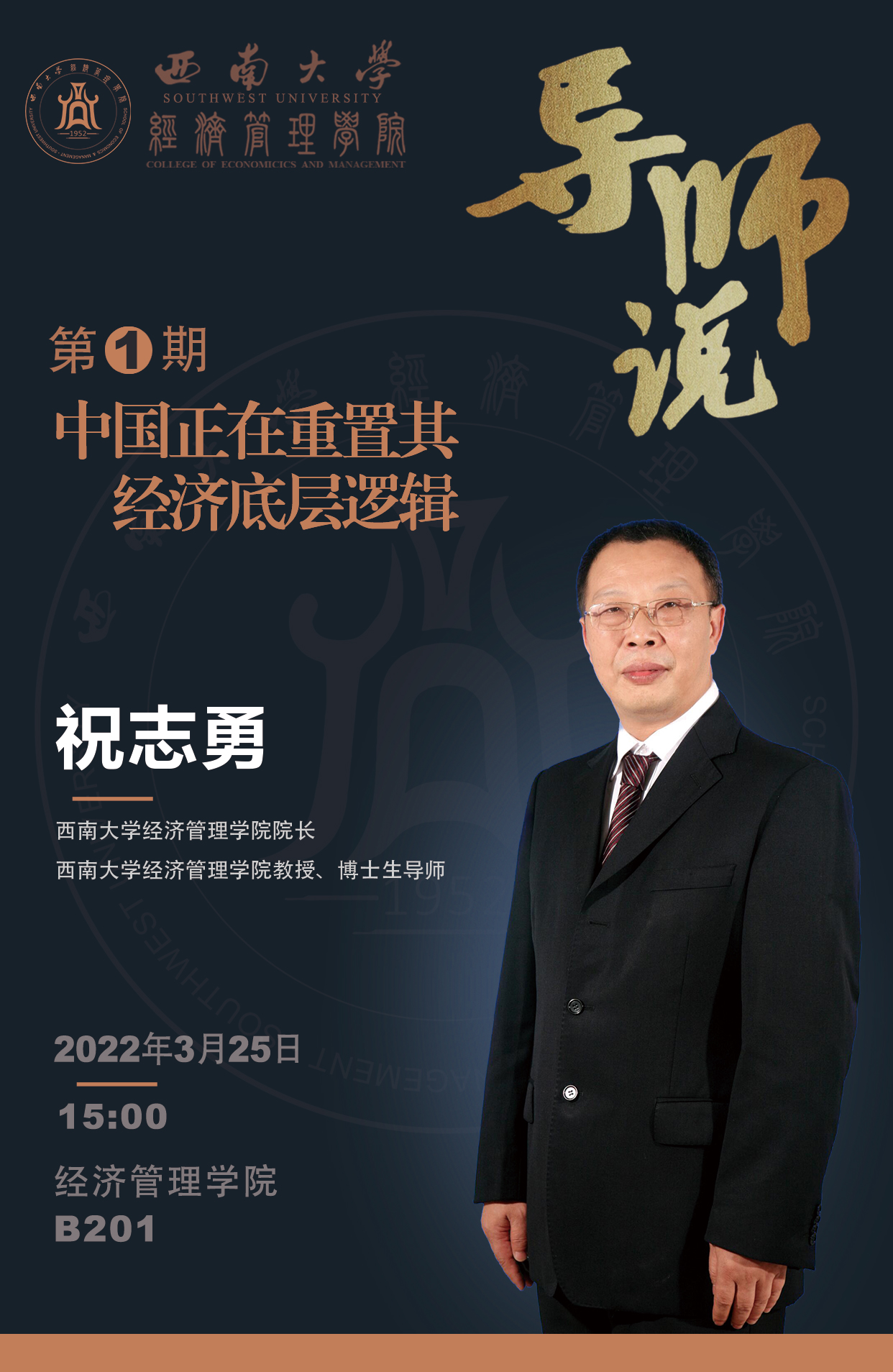 2022年3月25日15:00,“导师说”第1期即将举行。本期的主讲嘉宾为太阳成集团tyc522cc经理、博士生导师祝志勇教授,主讲题目为《中国正在重置其经济底层逻辑》,欢迎大家积极报名参与!