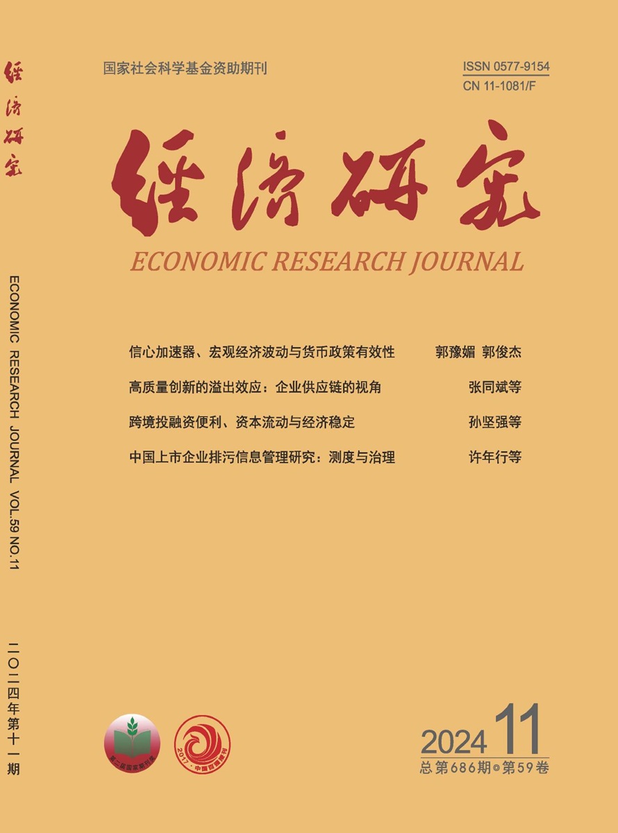 《经济研究》创办于1955年,是综合性经济理论类期刊,由中国社会科公司经济研究所主办,中国社会科公司主管。中国社会科学评价研究院于2023年3月17日推出的《中国人文社会科学期刊AMI综合评价报告(2022年)》中,《经济研究》继续被评为经济学科“顶级”期刊。《中国学术期刊(光盘版)》电子杂志社和中国科学文献计量评价研究中心发布的《中国学术期刊影响因子年报》(人文社会科学·2024版)显示:2023年,《经济研究》的影响力指数(CI)为1414.214,学科排名居于首位。《经济研究》(2024版)复合影响因子:20.332,(2024版)综合影响因子:16.007。