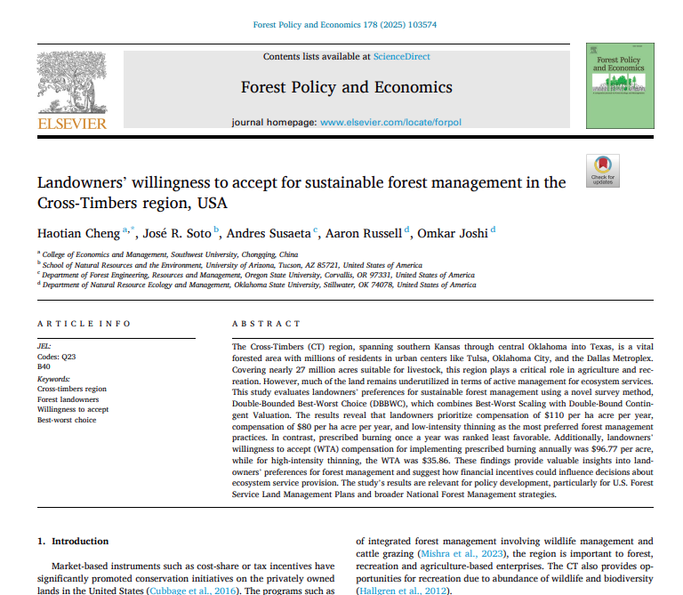 Cheng, H., Soto, J. R., Susaeta, A., Russell, A., & Joshi, O. (2025). Landowners’ willingness to accept for sustainable forest management in the Cross-Timbers region, USA. Forest Policy and Economics, 178 (103574). https://doi.org/10.1016/j.forpol.2025.103574