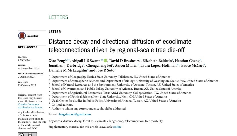 此外,程昊天副教授还与美国德克萨斯农工大学(Texas A&M University)教授、美国科公司院士、诺贝尔和平奖获得者 Bruce A. McCarl 等国际团队合作,于2023年在Environmental Research Letters 发表论文“Distance decay and directional diffusion of ecoclimate teleconnections driven by regional-scale tree die-off”,首次揭示森林枯死的生态气候远程效应的空间规律,为全球气候变化下的生态系统联动研究提供了重要理论创新。