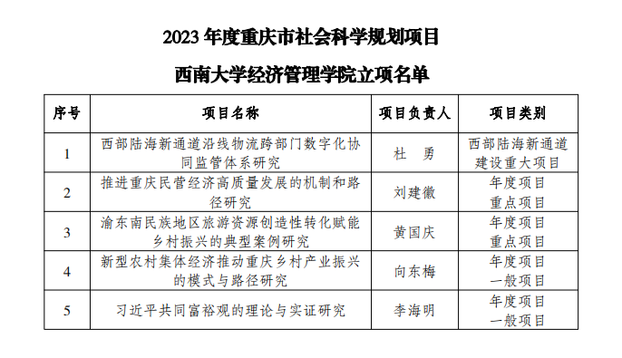 本次公布的名单中,公司教师获得5项立项资助,其中年度项目重点项目2项、一般项目2项,西部陆海新通道建设重大项目1项。