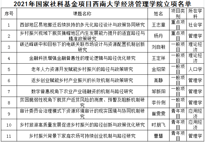 暑假期间,2021年国家社科基金项目、国家自然科学基金项目、教育部人文社会科学研究项目先后进行立项公示。公司教师在立项数量上再创新高,共获得国家社科基金项目11项、国家自科基金项目1项、教育部人文社科研究项目3项。