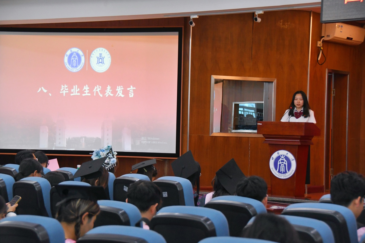 2025届简雨欣同学作为本科毕业生代表发言。她表示自己将带着母校“含弘光大,继往开来”的精神和公司“德合智达,立本励公”的品格,勇敢迎接未来挑战。2025届硕士唐阳平作为毕业研究生代表发言。她分享了以行动、坚持和担当为核心的成长感悟,号召同学们在新时代新征程中贡献青春力量。2022级本科生李金玥作为在校生代表发言。她送上真挚祝福,愿毕业生们心怀梦想,永葆初心,在未来的征程中绽放光芒。