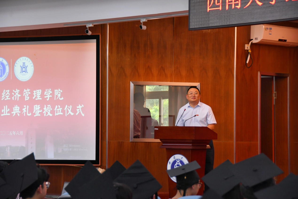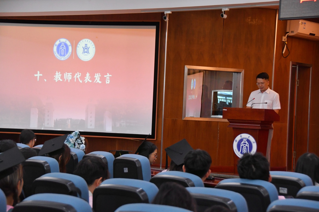 甘晓龙教授作为教师代表发言。他分享了三点期许,暨立身以“韧”、立业以“新”、立世以“公”,希望同学们锚定价值,坚持热爱,无畏前行。