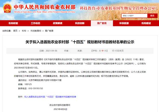 公司入选首批农业农村部“十四五”规划教材书目教材名单