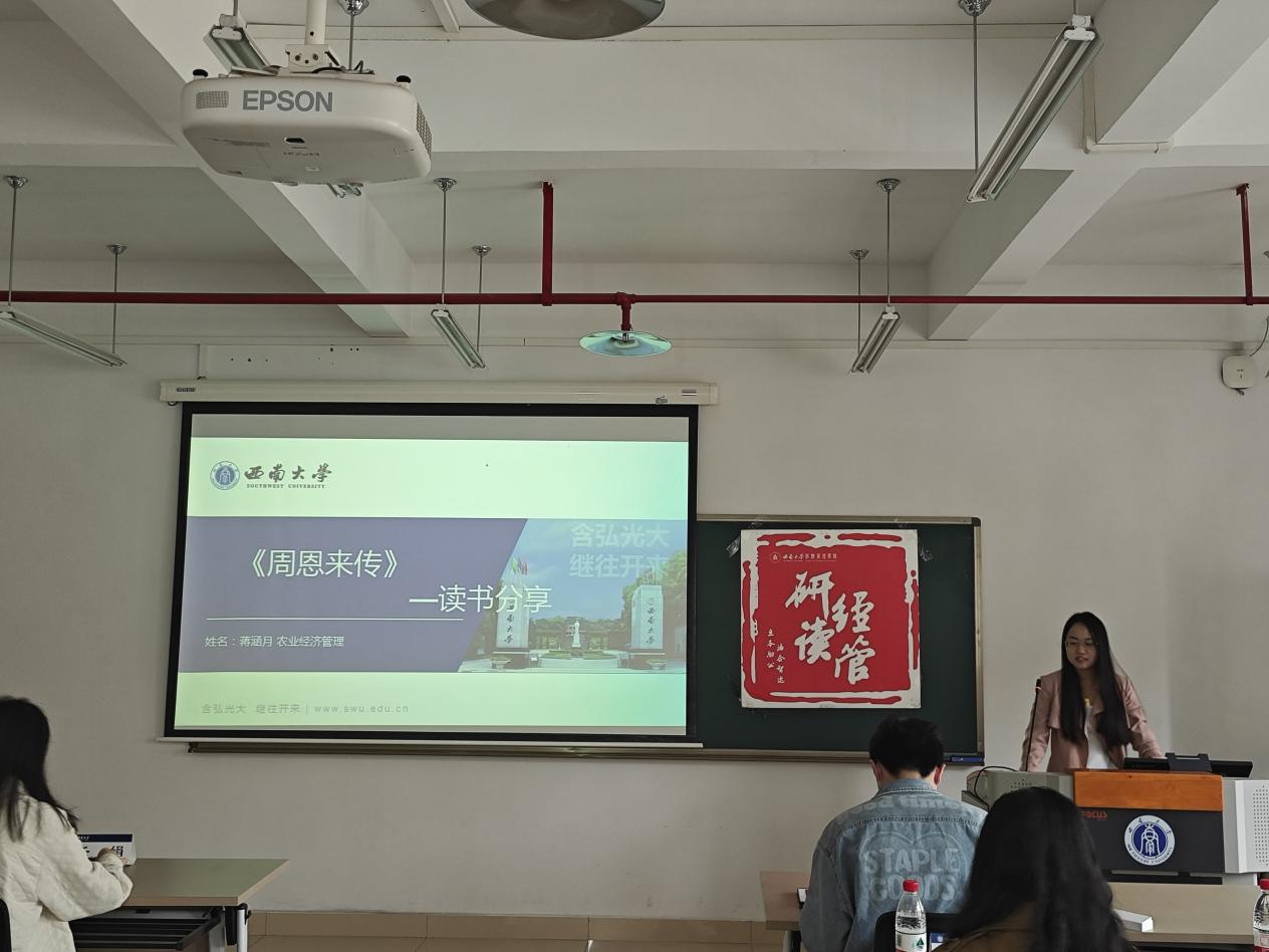 2024年3月22日下午,“研读•经管”研究生第二十一期读书会之“看千里江山,叹风流人物”读书分享会在公司A601教室举行。本次读书会由公司2023级农业管理专业硕士研究生周梦、2022级农业经济管理专业硕士研究生蒋涵月、产业经济学专业硕士研究生谭励慧和金融专业硕士研究生杨盼担任主讲人,公司研究生辅导员任娟出席本次活动。本次读书会由2023级金融专业硕士研究生李俊杰主持。