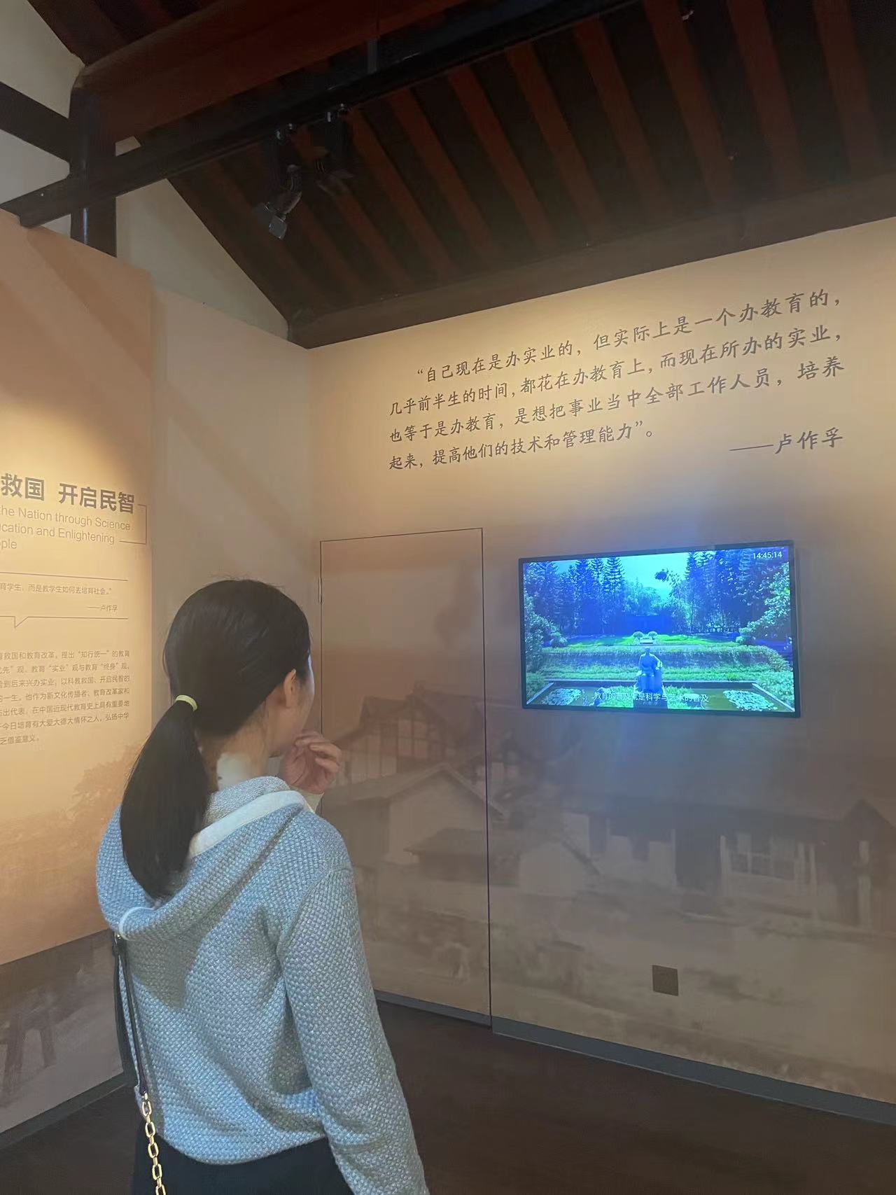 随后,同学们又来到中国西部科公司旧址陈列馆参观。这里是卢作孚先生创建的中国第一所民办科公司,里面坐落着卢作孚故居。抗战期间,许多学术机关纷纷迁于北碚,中国科学精神得以延续,近代中国的科学家们筚路蓝缕、砥砺前行,在此进行科学探索和奋斗,并为中国的发展和抗战持续不断地贡献力量。同学们穿梭于灰墙青瓦的楼宇间,行走在充满厚重历史气息的青石板路上,追寻着先辈的足迹,体会着历史的沧桑巨变。