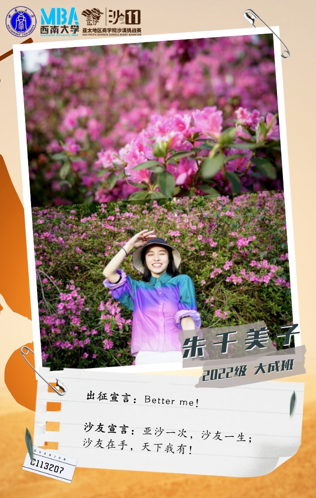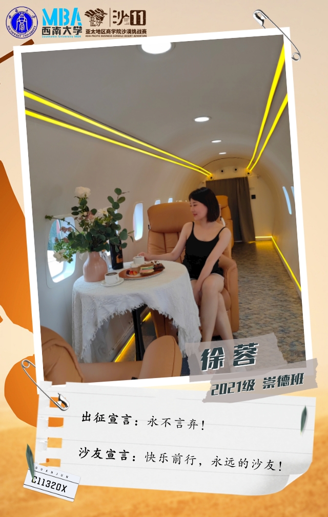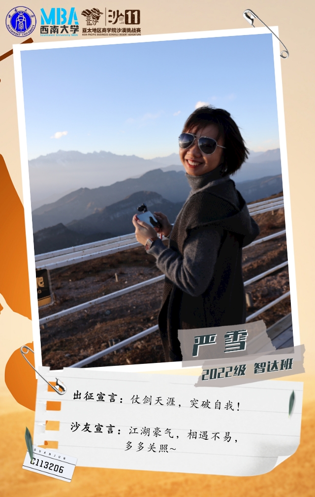 与西大MBA相遇,这种呼唤与感召将在亚沙的旅程变成现实,她坚信:人生的奇遇就是不同维度地对神秘进行探索!她既是C队成员,也是沙11tyc522cc太阳成集团的随行记者。