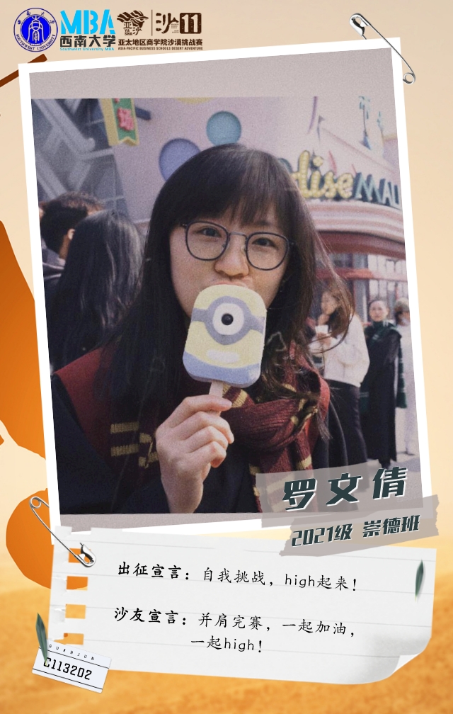 她是一个在MBA开学线下活动中,听“天生i跑俱乐部”发起人刘文宏宣讲亚沙后,被赛事深深吸引而加入俱乐部的温柔女孩。她从不爱跑步到报名挑战沙11,强身健体的同时,只为和沙友一起在沙漠中并肩前行!