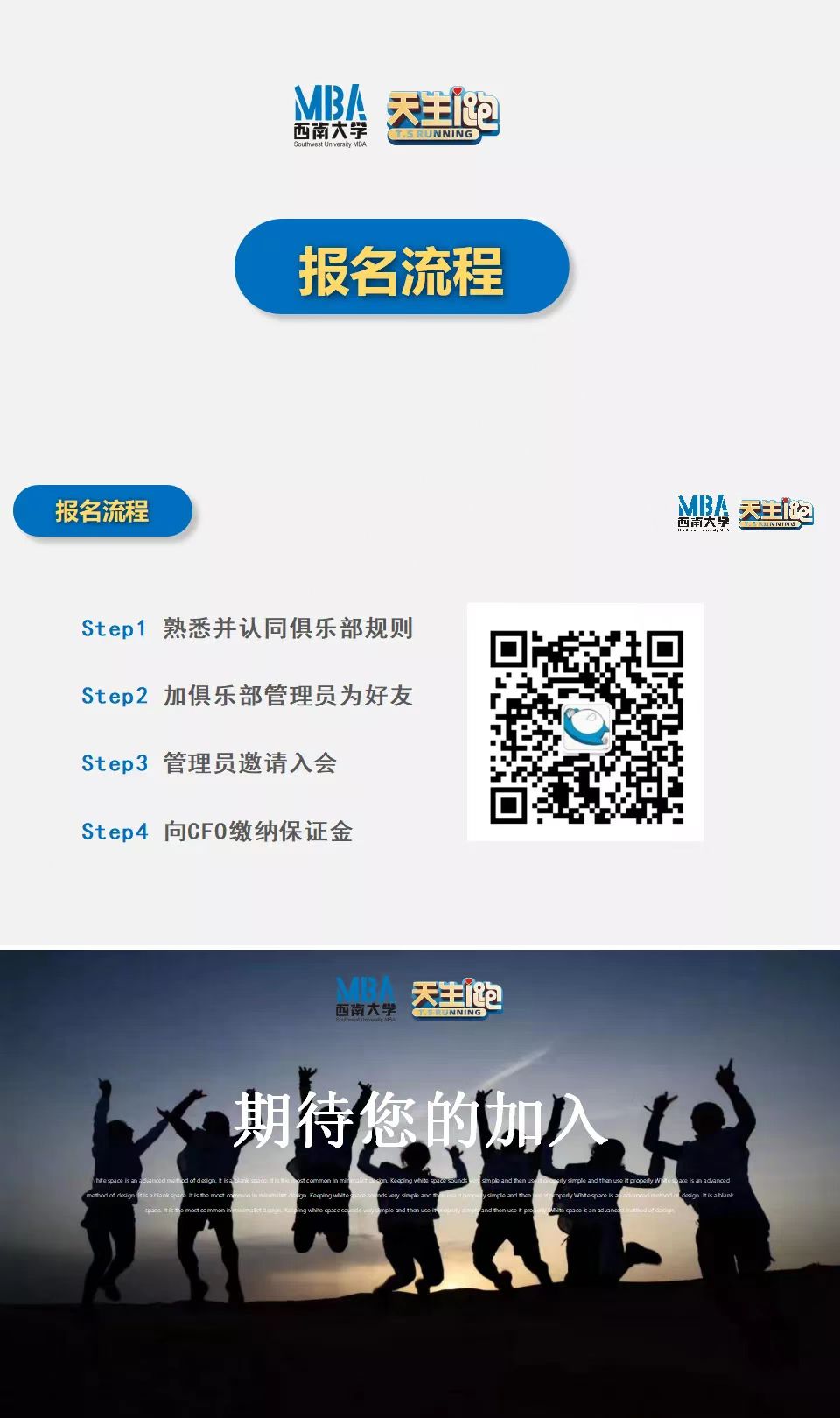 tyc522cc太阳成集团MBA天生i跑俱乐部(以下简称“俱乐部”)聚集了一群热爱运动的MBAer。在工作中,他们是各行各业的精英,在生活中,他们是家庭的顶梁柱,在俱乐部,他们是彼此的至交好友。他们有着参与运动的极大热情,被称为“西大体育生”,也具有强烈的集体荣誉感和社会责任感。自俱乐部成立以来,他们在各类比赛中取得了优异的成绩,2021年在第十届亚太地区商公司沙漠挑战赛中捧回最高荣誉“沙鸥奖”,为母校增光添彩。