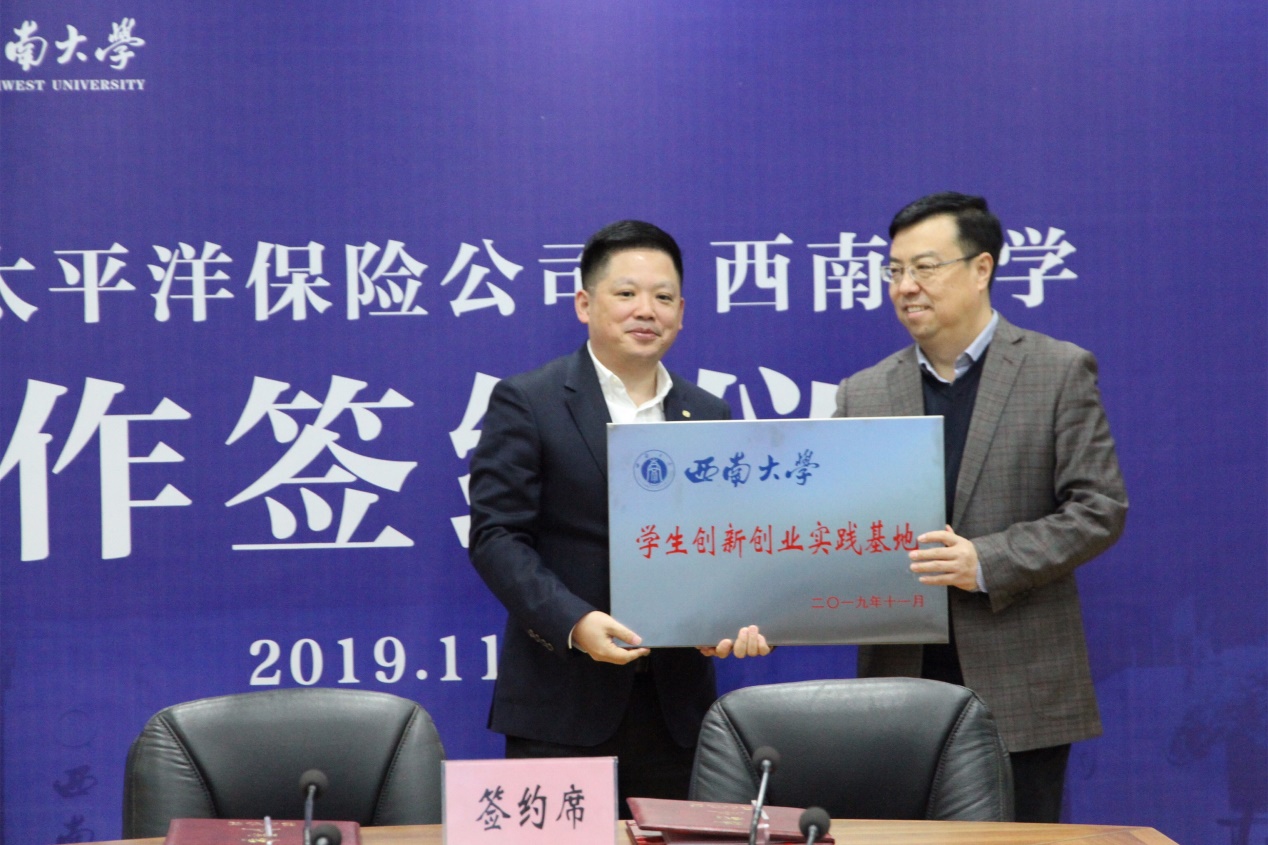 王进军副董事长与赵永刚副总裁代表双方签订合作协议,并为公司在太保重庆公司设立的员工创新创业实践基地授牌。