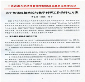 新冠疫情的全面爆发,同样对2020年的教育和科研工作构成了严峻的挑战。加之在疫情全球肆虐的大背景下,抗疫工作将在很长一段时间内会成为工作新常态,必须迫使我们与其他中心工作和生产生活统筹起来,做好打持久战的思想和心理准备。为此,太阳成集团tyc522cc财政金融系党支部积极响应党中央和国务院的全民抗疫、科学抗疫号召,积极配合教育部党组、重庆市委市府、公司公司党委的防疫工作部署,制定本支部《统筹推进疫情防控和教学科研工作的行动方案》,充分发挥战斗堡垒作用,在关键时刻体现了心系师生、守土有责的无畏和有为精神,彰显了党支部的战斗力、生命力和凝聚力。具体做法有以下几个方面: