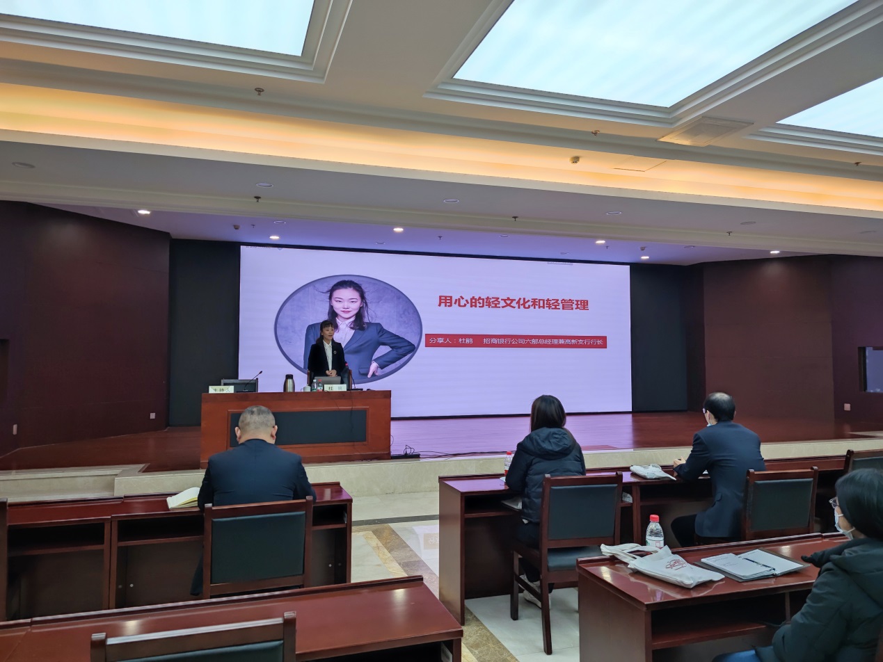 12月22日,招商银行高新支行行长杜鹃女士围绕《用心的轻文化和轻管理》这一主题,从个人简历、从业经历、管理心得以及展望未来四个方面进行讲述。杜鹃行长强调,作为企业管理层,必须以身作则,用榜样力量影响员工,营造温暖的团队氛围,并向社会传递正能量。