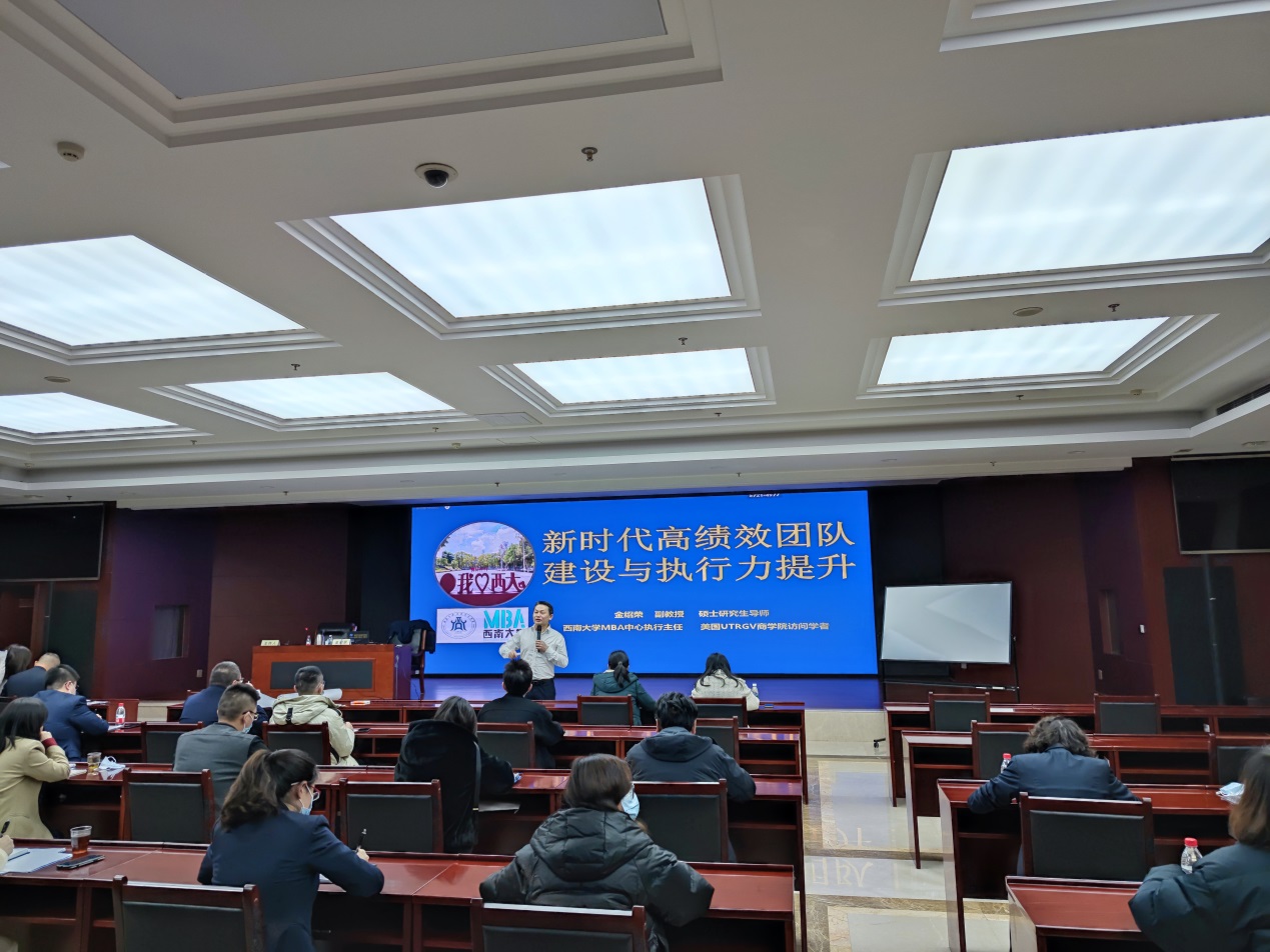 12月21日,太阳成集团tyc522cc金绍荣副教授围绕《新时代高绩效团队建设与执行力提升》这一主题,从我们的新时代、组织变革、团队建设、执行力提升四个方面展开讲述。金教授强调,在技术新变化、消费新潮流、绿色新革命的时代背景下,企业需要重塑组织能力、提高团队绩效,以适应瞬息万变的市场环境。在课程的尾声,金教授对此次受训学员送上了24字祝福语,即“选对组织、加入团队”、“聚焦目标、执行有力”和“及时修正、成人成事”。
