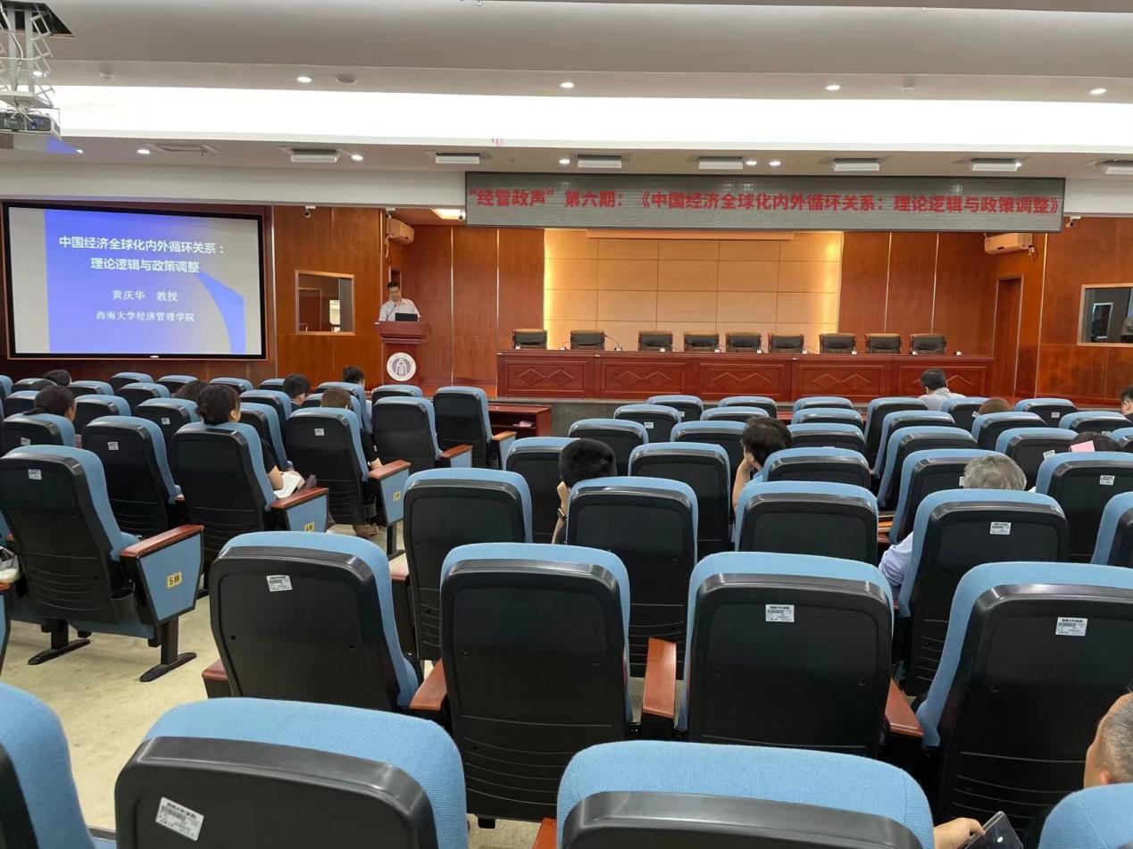 副经理黄庆华教授以《中国经济全球化内外循环关系:理论逻辑与政策调整》为题,作“经管政声”第六讲。他系统梳理了经济“双循环”定义及其演进理论逻辑,总结了我国近年来贸易依存度变动过程及原因,重点分析了新冠疫情及中美战略竞争对全球经济影响,并为优化我国经济“双循环”发展格局提出策略参考。