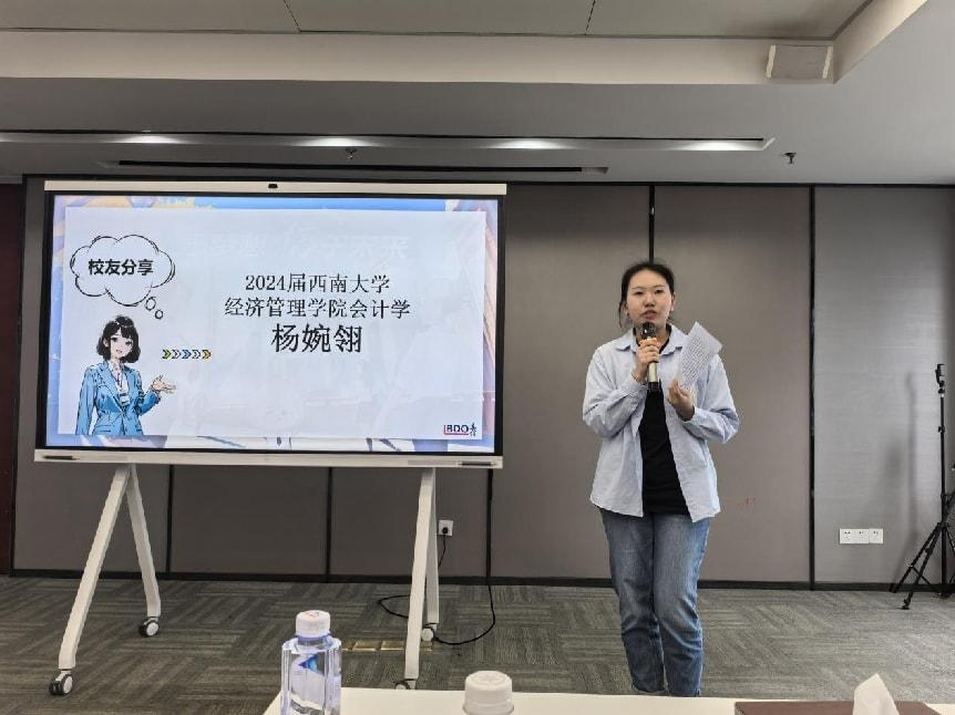 立信重庆分所高级经理湛江,人力资源部经理秦于晋,2024届员工、基础审计员杨婉翎分别结合自身工作经历,围绕立信会计师事务所的历史沿革和企业文化,会计审计行业发展路径,职业技能培养路径等方面分享交流。通过实地参访、行业专家和员工经验分享,互动答疑,同学们近距离感受到了行业标杆企业的管理理念与创新技术,深度了解了会计行业的运作模式与前沿趋势,不仅拓宽了职业发展视野,更激发了同学们将理论知识与实务场景相结合的实践热情。