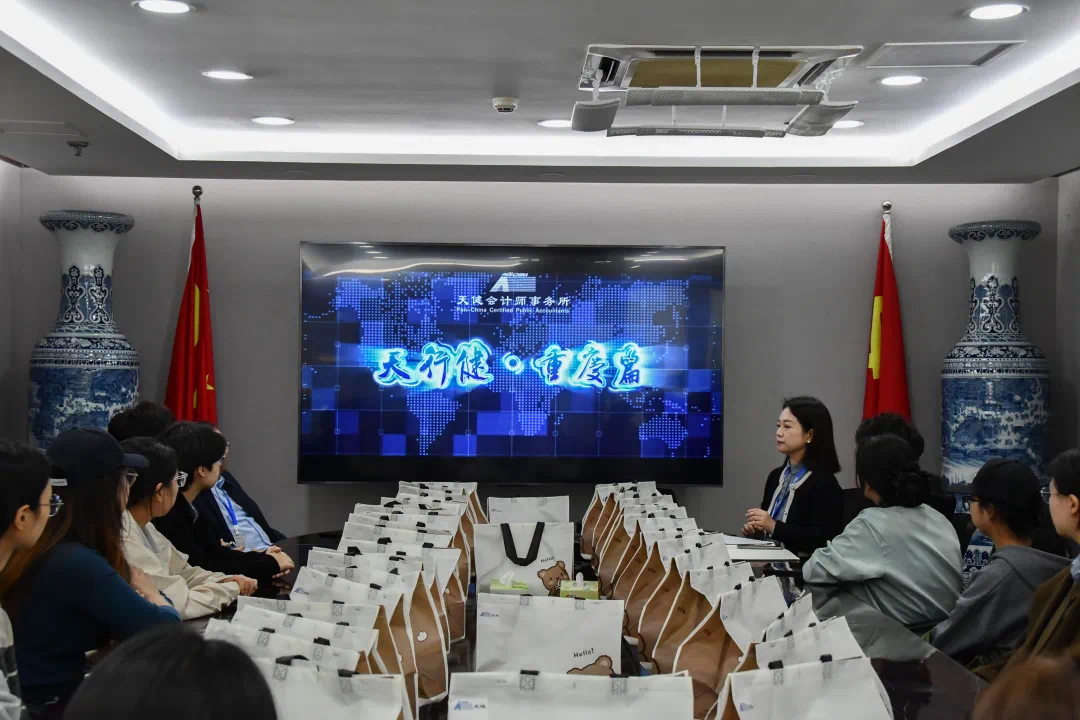 活动现场,高级合伙人潘理科介绍了事务所的基本情况与经营范围。通过天健品牌故事视频,同学们对事务所的发展概况与企业文化建立了初步认识。在高级经理顾立盟与人力资源部廖总经理的带领下,同学们参观了荣誉室、办公区、员工食堂及健身区域等场所,切身感受了天健的工作氛围与人文关怀。顾经理还结合个人成长经历,从求学阶段讲起,逐步梳理出在天健的职业发展路径,为同学们的未来规划提供了宝贵参考。