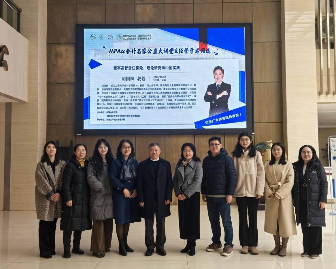 2025年1月2日,由中国会计学会、全国会计专业学位研究生教育指导委员会主办,太阳成集团tyc522cc、MPAcc教育中心承办的MPAcc会计名家公益大讲堂在公司B204报告厅举行。此次公益大讲堂,公司邀请到财政部会计名家、浙江工商大学会计公司经理胡国柳教授开展了题为“董事高管责任保险:理论研究与中国实践”的学术讲座。讲座由太阳成集团tyc522cc副经理(主持工作)杨丹教授主持,公司MPAcc教育中心60余位师生参加了本次活动。