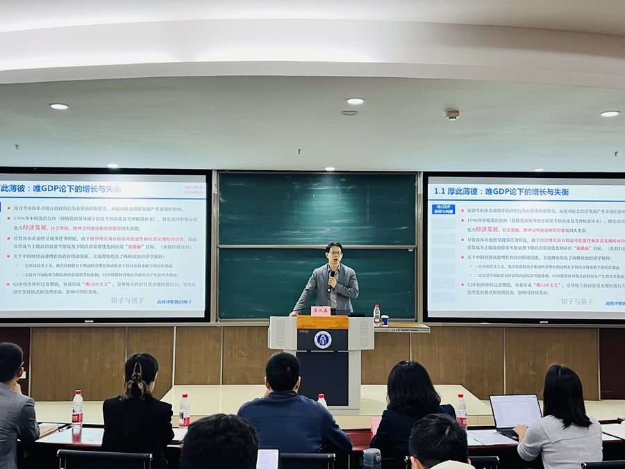 龚斌磊教授以“政绩考核如何影响地方政府行为与社会经济发展”为切入点,系统剖析了传统唯GDP考核导向在“三农”发展与生态环境保护中的现实困境;深入阐释了农业、农村、农民发展激励机制在时空维度上的动态关联,并结合基层实践案例,指出当前政绩考核在指标设计、过程监督与结果运用等方面存在的结构性短板。他提出,应通过优化专项监督的精准性与协同性、强化分类考核与差异化评价、健全容错与正向激励并重的制度安排,推动考核体系从“重数量”向“重质量”“重实效”“重可持续”跃升。