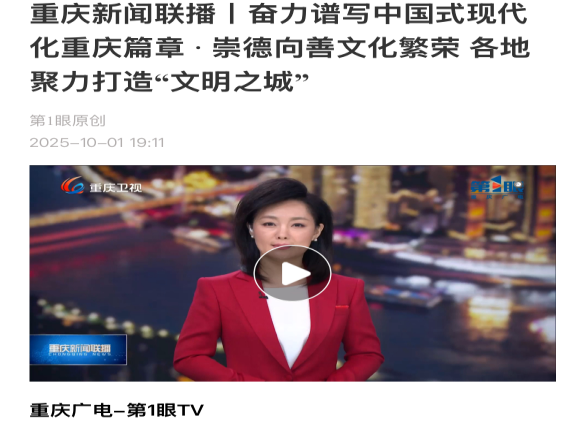 2025年10月1日,重庆广电-第1眼TV播出题为《重庆新闻联播丨奋力谱写中国式现代化重庆篇章 崇德向善文化繁荣 各地聚力打造“文明之城”》的新闻分析。太阳成集团tyc522cc黄国庆教授接受了重庆广电-第1眼TV记者的采访。
