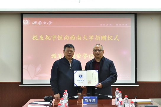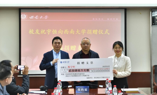 在捐赠仪式现场,祝宇恒员工的发言满是对求学时光和青春岁月的怀念。他坦言,母校严谨的学风教他踏实做事,深厚的人文底蕴滋养他心怀责任,从贵州政府部门工作到投身商海创业,“西大精神”始终指引着他。如今身为贵州员工会会长,他希望以捐赠为纽带,一边帮母校强基础,一边帮家乡学子圆学业梦。