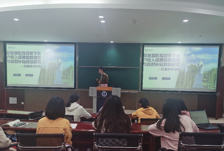 杨柯凡以“论文写作灵感和思路”为主题进行了分享。他认为论文写作灵感主要来源于导师课题、经典文献整理、课程论文撰写、微信公众号等。他还详细介绍了论文《新发展阶段背景下农户收入保障指数测度与政府补贴效应研究—以重庆市为例》。该论文立足脱贫攻坚战取得全面胜利的新形势和“两不愁、三保障”的多维贫困标准,从重庆市区县实地调研中获取问卷调查数据,采用熵值法和工具变量分位数模型计算出相应指数,并基于上述分析得出了教育补贴、医疗补贴等对农户的收入保障指数有促进作用等结论。
