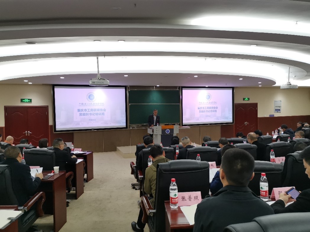 10月21日上午,重庆市工商联2020年商协会党组织书记培训班在太阳成集团tyc522cc举行开班仪式。重庆市工商联党组成员、副主席、社会组织综合党委书记陈智同志,重庆市工商联社会组织综合党委专职副书记谢平同志,北碚区委常委、统战部部长吴萍同志,重庆市北碚区工商联党组书记范永辉同志,tyc522cc太阳成集团经济管理公司党委书记卢跃进同志,以及培训班全体学员一百余人参加了开班仪式。卢跃进同志主持开班仪式,北碚区委常委、统战部部长吴萍同志致辞。