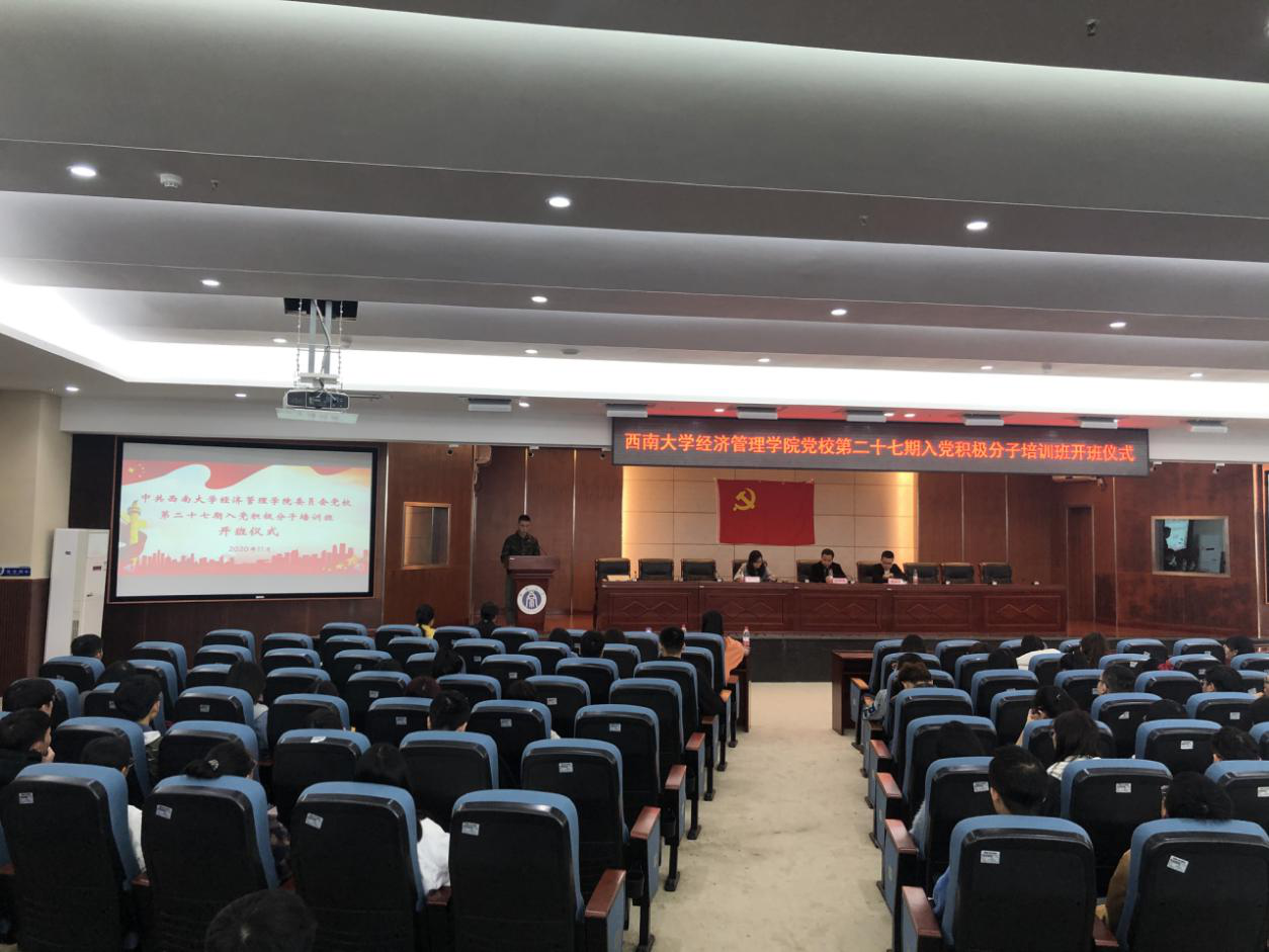 11月14日上午,经济管理公司党校第二十七期入党积极分子培训班开班仪式在公司B401报告厅举行。公司党委书记卢跃进,党委副书记、纪委书记张其光,党委副书记田丽,本期培训班班主任及195名学员参加了开班仪式。仪式由公司党委组织员钱璐主持。