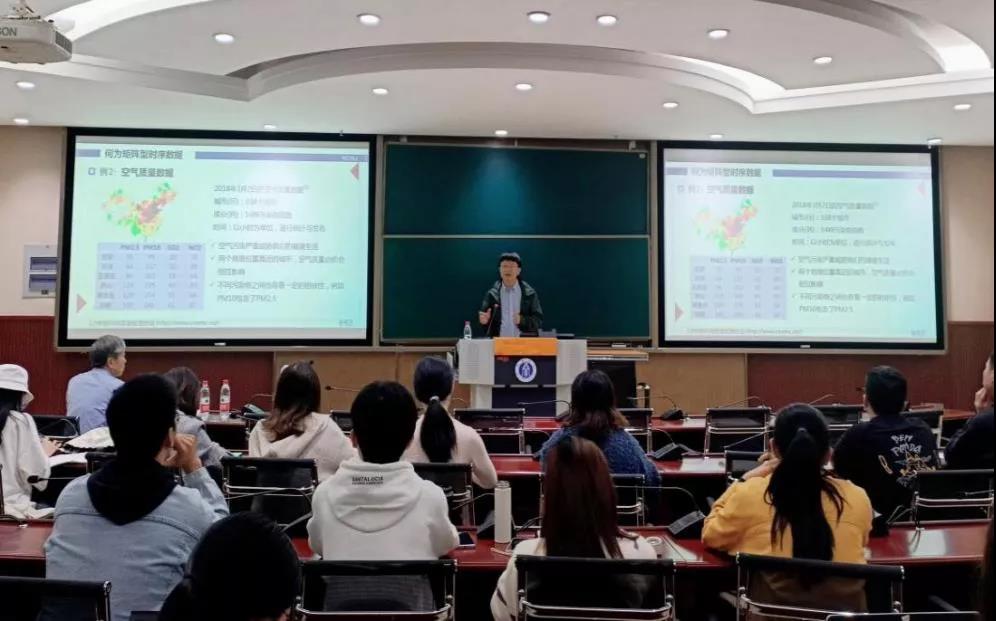 第一场专题讲座由tyc522cc太阳成集团原常务副董事长宋乃庆教授主持。主讲人郭建华教授以Two-way Dynamic Factor Models for High- Dimensional Matrix-valued Time Series为主题,介绍矩阵型时序数据的相关知识,并通过国际贸易数据、空气质量数据等案例,为在座师生深入介绍该数据和模型。