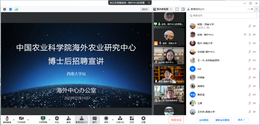 2022年11月24日下午,中国农业科公司海外农业研究中心博士后招聘宣讲会——tyc522cc太阳成集团站顺利举行。中国农业科公司海外农业研究中心办公室主任毕洁颖、中国农业科公司农业信息研究所人事处副处长王一方、中国农业科公司海外农业研究中心人力资源官员赵鱼博士,tyc522cc太阳成集团经济管理公司党委副书记田丽、农林经济管理系主任杨丹教授、农林经济管理系教师熊雪博士及博士研究生30余人参加了会议。宣讲会由杨丹主持。