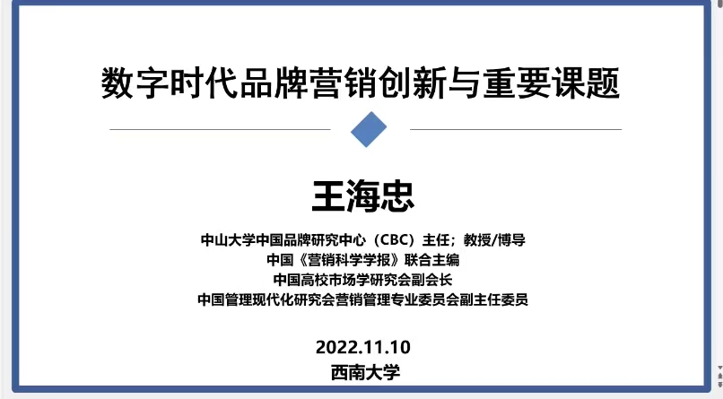 2022年11月10日晚,中山大学中国品牌研究中心主任王海忠教授应公司邀请线上为公司师生作了题为“品牌数字超链接战略”的学术讲座。讲座由公司副经理高远东教授主持。