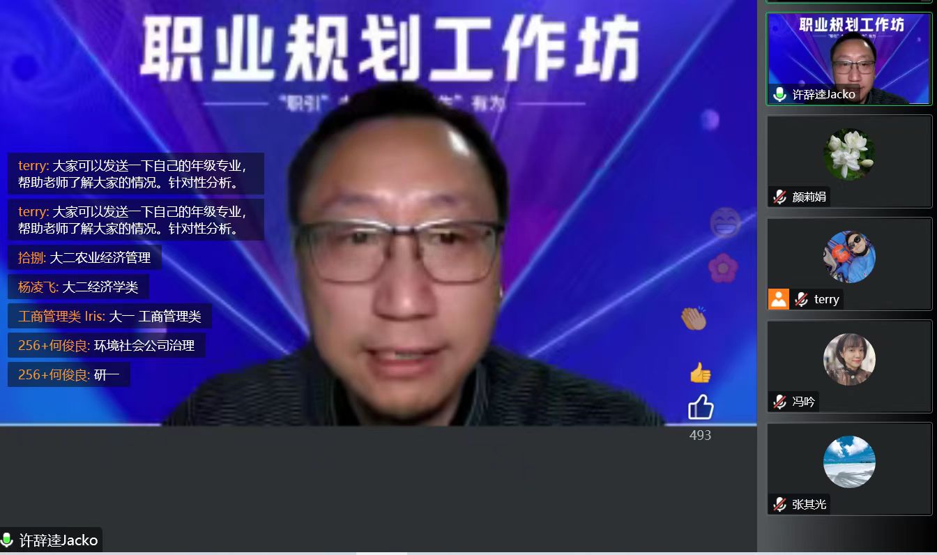 许老师首先为同学们分析了近年毕业生就业、校招招聘形势,就业市场总体情况竞争激烈。接下来许老师和同学们一起探讨了“在国内进入名企需要哪些必备能力”这个问题,同学们在线上积极与许老师互动,许老师从“领导力、商业思维、人际关系、专业技术、国际视野”五个角度为同学们展开讲解。最后许老师围绕咨询、金融等行业,为同学们分析了行业特征、人才特征以及进入该行业所需要做的准备。在互动环节,同学们还就自己感兴趣的话题向许老师请教,得到了许老师专业的指导。大家纷纷表示,许老师的讲座有很强的现实意义,不仅为分析了就业形势,还提供了求职经验,收获颇丰。