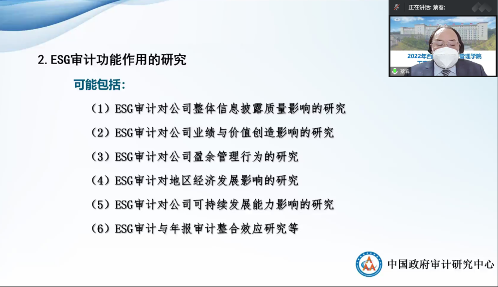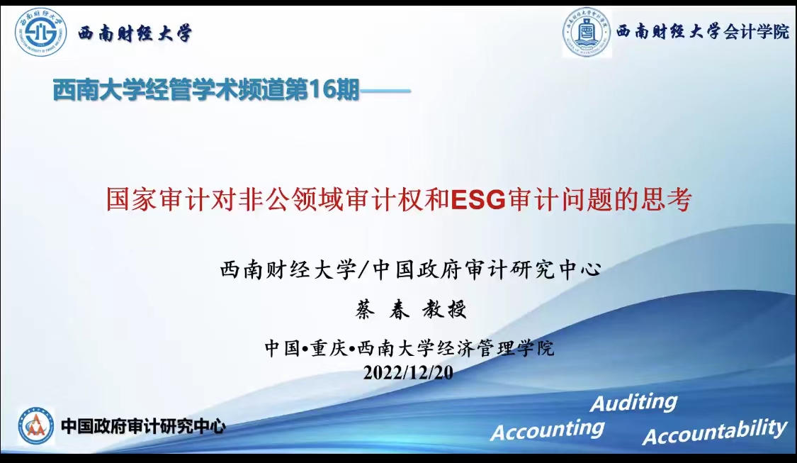 2022年12月20日下午,西南财经大学教授、博士研究生导师蔡春应公司邀请线上为公司师生作了题为“国家审计对非公领域审计权与ESG审计问题的思考”的学术讲座。本次讲座由公司经理祝志勇教授主持。