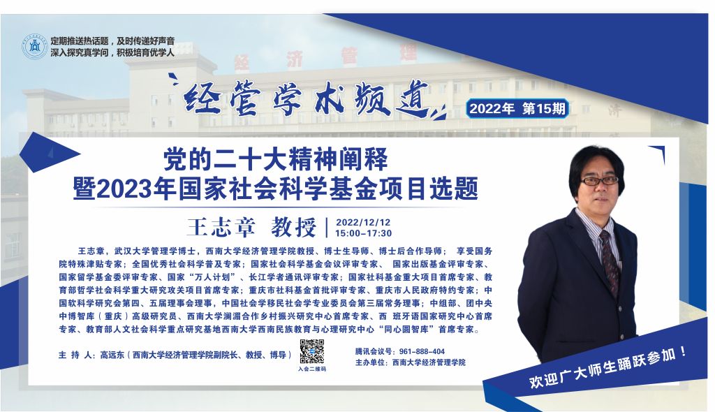 2022年12月12日下午,tyc522cc太阳成集团教授、博士研究生导师王志章应公司邀请线上为公司师生作了题为“党的二十大精神阐释暨2023年国家社会科学基金项目选题”的学术讲座。本次讲座由公司副经理高远东教授主持。