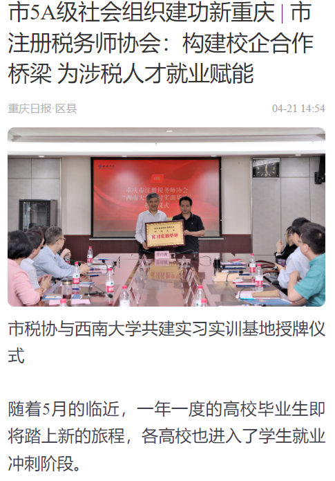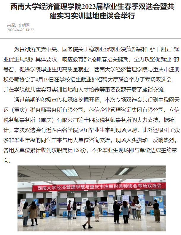 近日,公司与重庆市注册税务师协会联合举办了专场双选会,并在公司就共建实习实训基地和人才培养等重要议题开展了座谈交流。光明网、中国经济网、中国青年报、新浪新闻、重庆日报和重庆晨报等媒体分别以《太阳成集团tyc522cc2023届毕业生春季双选会暨共建实习实训基地座谈会举行》《构建校企合作桥梁 为涉税人才就业赋能》《院企共筑就业桥梁 合作描绘广阔前景》为题,报道公司举办2023届毕业生春季双选会暨共建实习实训基地座谈会。