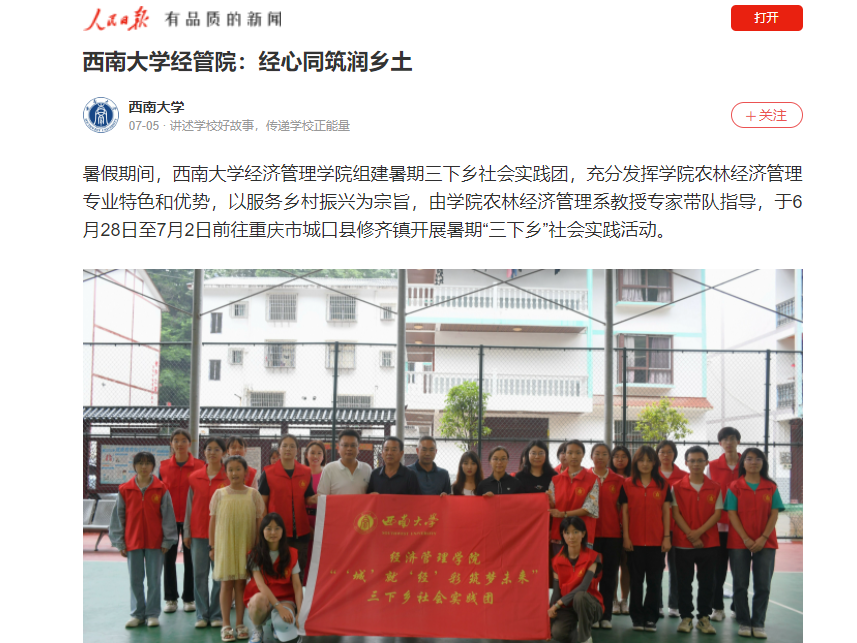 本次活动由公司农林经济管理系教授高静、团委书记邓林楠、辅导员宁霞带队指导十九名老员工志愿者成功开展并获得热烈反响,活动被人民日报、重庆日报、华龙网等多家重量级媒体平台报道。