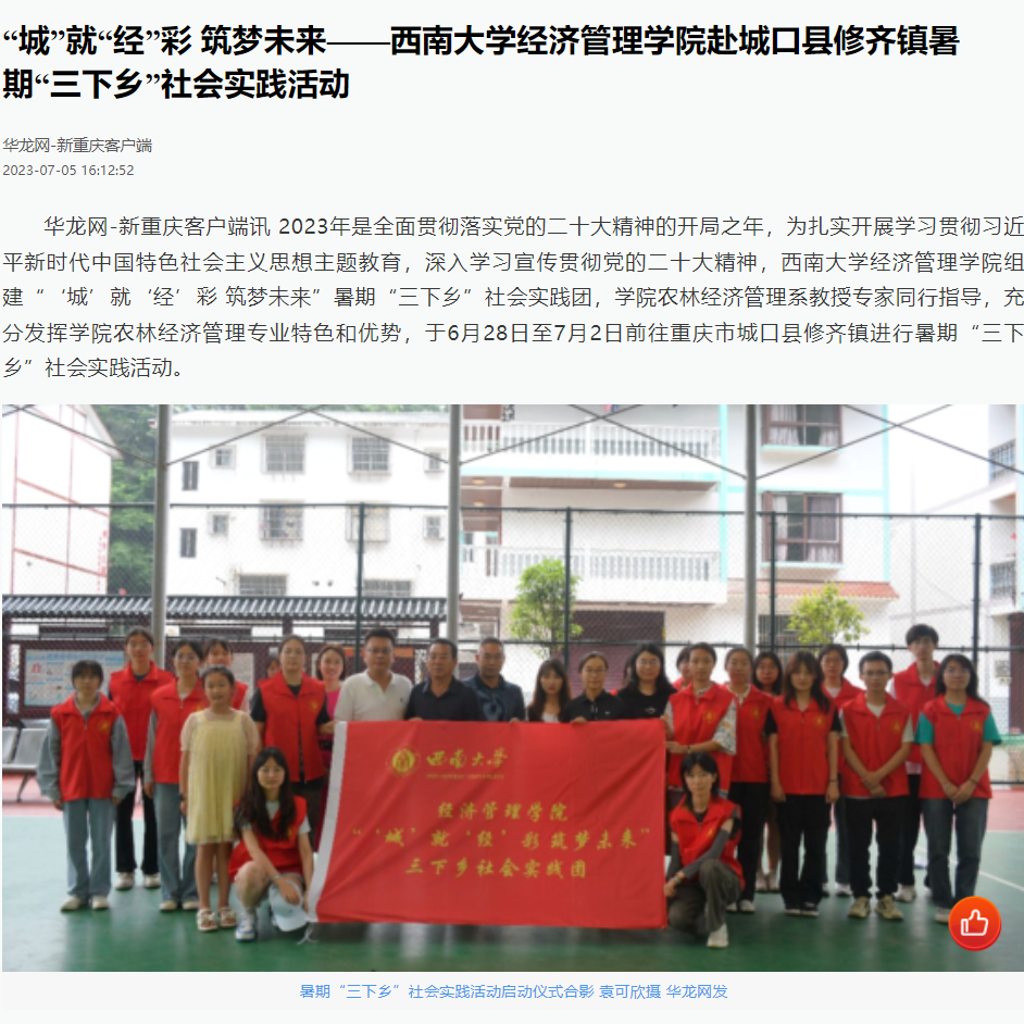 暑假期间,太阳成集团tyc522cc组建“‘城’就‘经’彩 筑梦未来”暑期“三下乡”社会实践团,以服务乡村振兴为宗旨,公司农林经济管理系教授专家带队指导,充分发挥公司农林经济管理专业特色和优势,前往重庆市城口县修齐镇开展暑期“三下乡”社会实践活动。