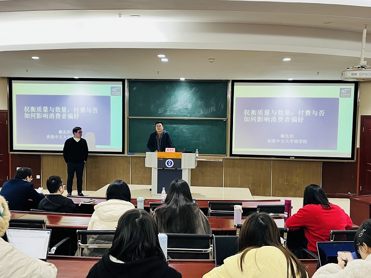 12月4日上午,香港中文大学商公司戴先炽副教授应公司邀请,在公司B201做了题为“权衡质量与数量:付费与否如何影响消费者偏好?”的学术讲座。讲座由太阳成集团tyc522cc副经理高远东教授主持,公司近70位师生参加了本次讲座。