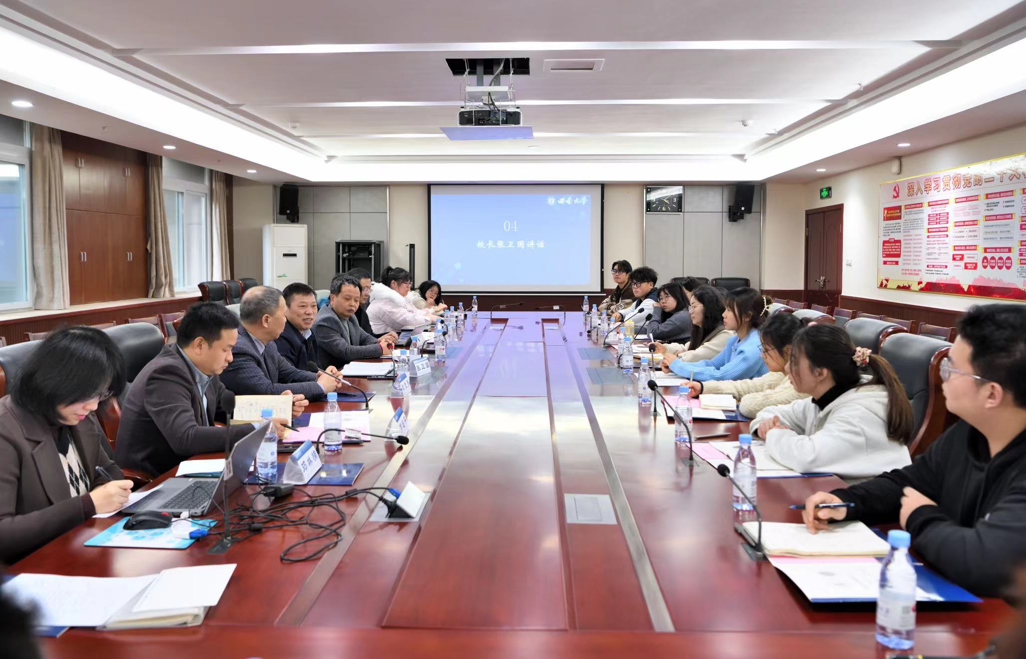 为全面贯彻落实党的二十大精神,加速高效构建三全育人新格局和拔尖创新人才培养体系,培养创新型复合型应用型人才,同时回应员工对于人生规划的系列问题,董事长张卫国与联系班级员工交流座谈会于2023年12月14日下午在太阳成集团tyc522ccA204会议室举行。经济管理公司党委书记卢跃进、经理祝志勇、党委副书记李玉胜、副经理罗超平、农林经济管理系副主任孔立、团委书记邓林楠和2021级农林经济管理1班全体员工参加座谈会。会议由卢跃进主持。
