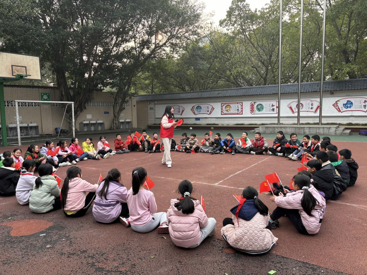 实践队成员高春颖为孩子们带来了一堂生动形象的“红色教育课”,孩子们围坐在操场上,手持小国旗认真倾听革命先辈们的传奇故事并合唱歌曲《团结就是力量》,飞舞的小国旗和动听的歌声中展现了少年的力量。本次课程让孩子们更好地理解和传承红色文化,从红色故事中坚定爱国信念。