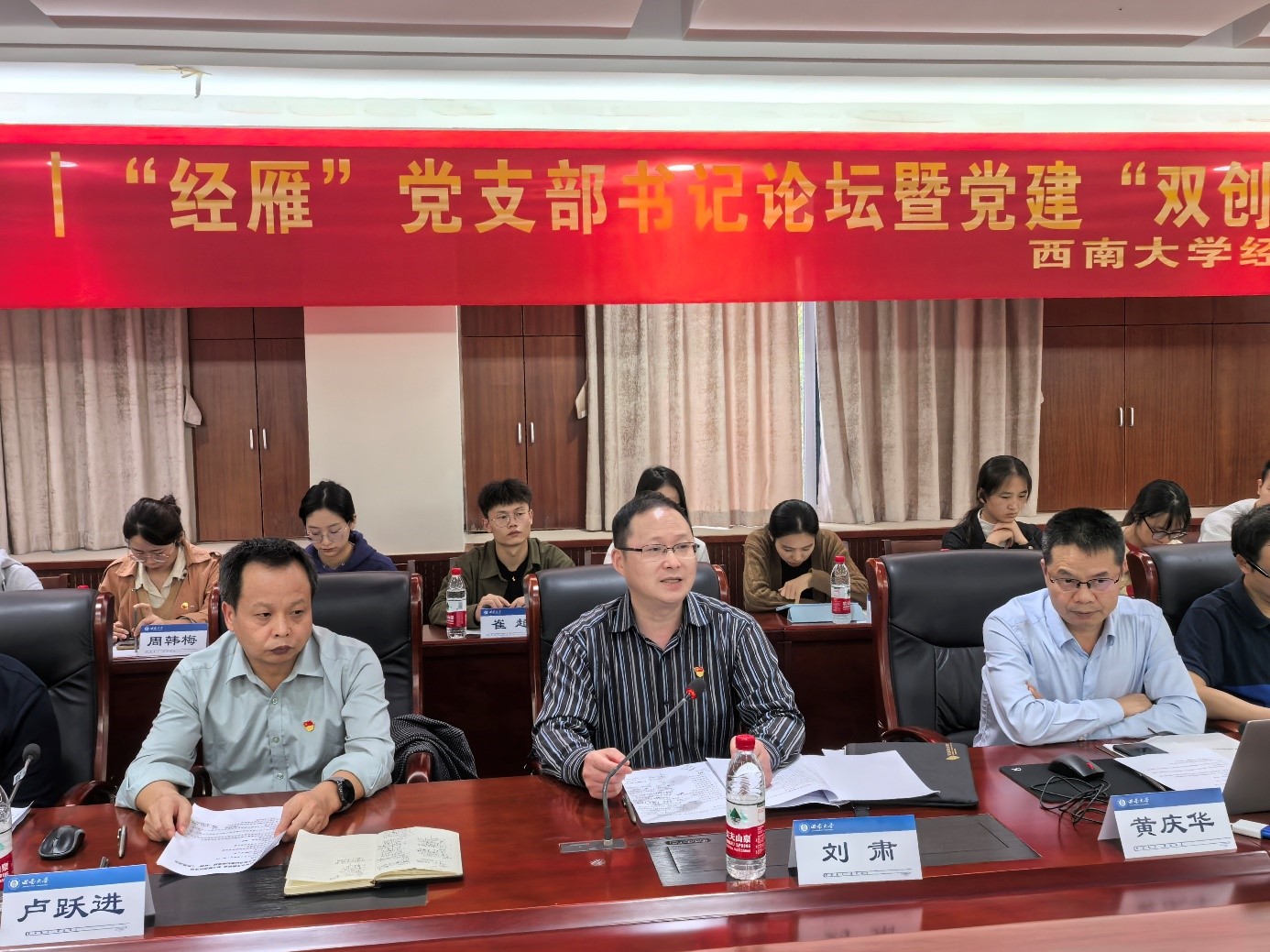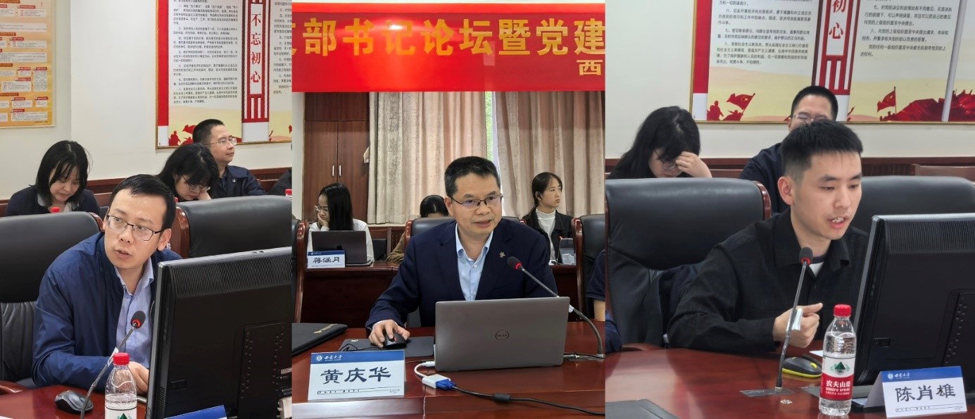 集团第二批样板支部培育创建单位、公司经济系教师党支部书记刘自敏,公司第二批研究生样板党支部培育创建单位、公司研究生第二党支部书记黄庆华,公司依托科研团队创新打造的乡村振兴与金融创新团队师生联合党支部教师陈肖雄,分别汇报了支部建设方案,并重点介绍了支部结合学科专业实际,分别通过打造“经”益求精党建工作品牌,形成“12345”工作思路;打造“经”英共研·“经”彩党建工作品牌,构建“1+2+X”模式;通过打造“乡”约奋进·“金”彩纷呈党建工作品牌,推进“五个工程”建设等特色做法。